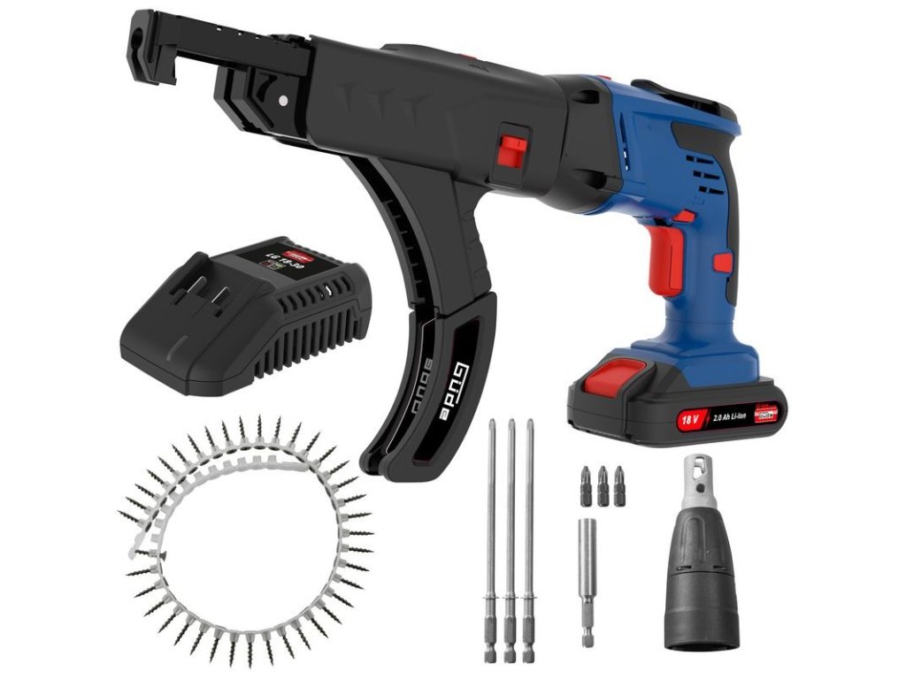 Akumulátorový skrutkovač so zásobníkom na skrutky ideálny na interiérové práce a práce so sadrokartónom. Jednoduché prestavenie skrutkovača so zásobníkom na skrutkovač pre prácu so sadrokartónom bez použitia náradia. Ergonomický a pohodlný kryt motora pre prácu jednou rukou. Pogumovaná rukoväť, chod vpravo/vľavo, automatické podávanie skrutiek, 5-násobne prestaviteľný hĺbkový doraz, plynulé nastavenie hĺbky skrutkovania, automatický pohonný mechanizmus pre spustenie a zastavenie. Dĺžka skrutiek: 9 – 55 mm. Držiak bitov s rýchlouzáverom.