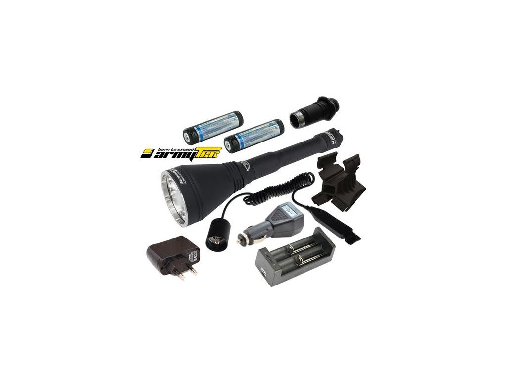 Kompletný set na lovecké a iné účely. Najlepší dosah svetla od výrobcu ArmyTek má model Barracuda Pro XHP35 Hi ktorá produkuje výkon až 1850 lumenov a dosahom svetla do 900 metrov podľa normy ANSI/NEMA. Veľkou výhodou vyhľadávacieho svetla Barracuda Pro je možnosť napájať ju jedným Li-ion akumulátorom 18650 najlepšie s kapacitou nad 3000mAh. Vďaka tejto možnosti takmer nemá konkurenciu. V balení sa nachádza aj telo na 2 akumulátory ktoré stačí jednoducho prešróbovať. Výkon ostáva identický no výdrž na predĺži pri použití 2 akumulátorov. V Prípade že použijete 2 akumulátory musia mať PCB ochranu aby sa nezničili príliš hlbokým vybitím. Barracuda Pro je skutočnou pýchou medzi ručnými značkovými LED baterkami aj vďaka už spomenutými výhodami ale aj vďaka vodotesnosti do 50 metrov IP68 najväčšie krytie a nárazuvzdornosťou z výšky až 30 metrov okrem šošovky. Telo je vyrobené zo zliatiny leteckého hliníka z jedinečnou povrchovou úpravou - technicky vyspelým pogumovaním. Vďaka tomu je na dotyk veľmi príjemná a hneď je cítiť zmenu pri ktorej viete že držíte v ruke neobyčajné svetlo. Počet režimov je 9 čo postačuje na nastavenie presne takého výkonu aký v danej chvíli potrebujete. Ovládanie je veľmi jednoduché. Keď je dotiahnutý reflektor je možné zapnúť výlučne 100% výkon 1850 lumenov čo je veľká výhoda pretože nedokážete nechcene zapnúť slabší v tej chvíli nežiadúci režim. Ak chcete aktivovať slabší režim je treba povoliť reflektor o asi 1 cm nechať ho povolený a vtedy môžete vypínačom v zdanej časti prepínať jednotlivé režimy. Môžete vypínač namačkávať bez hluku alebo zo zvukovým doprovodom prepínať stláčaním vypínača. Ak chcete prejsť v sekunde na plný výkon stačí len dotiahnuť reflektor. Barracuda Pro XHP35 Hi je vhodná pre tie najnáročnejšie potreby vo vojsku, lovecké účely, turistiku a mnoho iných odvetvý.Technické parametre