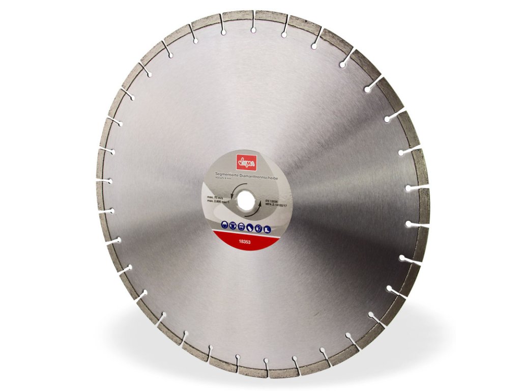 Segmentovaný diamantový kotúč 450x25,4 mm vhodný na betón, betónovú dlažbu, dlažobný kameň, obrubníky, strešnú krytinu, dosky z plaveného betónu, žulu, poroton. Špeciálna geometria = tepelne optimalizovaný rez. Menej vhodný pre dlažbu a mramor. Segmentovaný diamantový kotúč 450x25,4 mm vhodný na betón, betónovú dlažbu, dlažobný kameň, obrubníky, strešnú krytinu, dosky z plaveného betónu, žulu, poroton. Špeciálna geometria = tepelne optimalizovaný rez. Menej vhodný pre dlažbu a mramor. Priemer kotúča: 450 mm Priemer otvoru: 25,4 mm Výška segmentu: 11 mm Hrúbka segmentu: 4 mm Maximálne otáčky: 2800 ot./min. Maximálna rezná rýchlosť: 70 m/s Hmotnosť: 3,51 kgDodatočné parametre