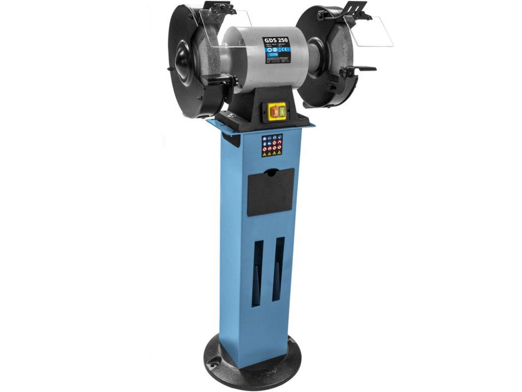 Brúska na stabilnom podstavci, kovový kryt, hrubý a jemný brúsny kotúč s adaptérom 20 mm. Dva kryty kotúčov vrátane orovnávacieho nástroja. Vysoká presnosť. Základňa s uhlovým označením.