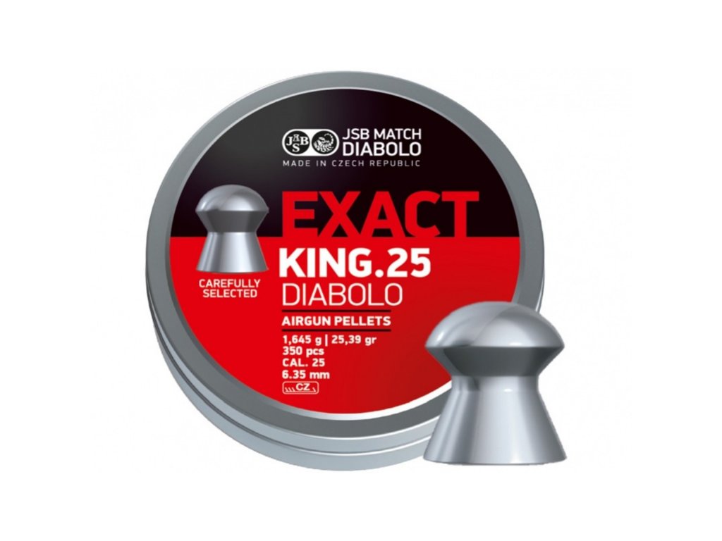 JSB Exact King 6,35mm 350ks s pologuľatou hlavičkou a hmotnosťou 1,645 g je prvé strelivo od spoločnosti JSB vyrábané v kalibri 6,35mm. Bolo precízne ako vyrobené tak aj skontrolované a otestované.