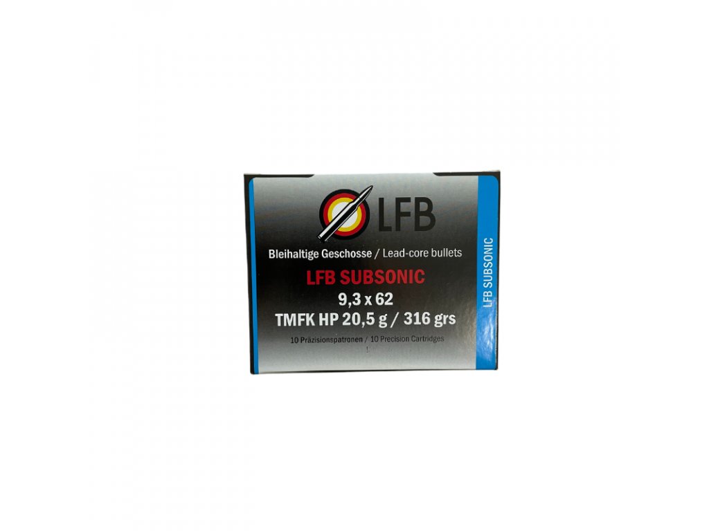LFB Subsonic 9,3×62 TMFK HP 20,5g je špeciálne podzvkové strelivo vyvinuté pre lov poľovníkov, vzhľadom na ich mierne sploštenú špičku a tenkostenný plášť v prednej časti. Podzvuková munícia eliminuje hluk je ťažšia a zmenšuje hluk v ústí hlavne kvôli svojej nižšej rýchlosti. Je to len jeden zo spôsobov, ako zmierniť hluk. Toto strelivo sa používa v kombinácií s tlmičom hluku. Riadená a spoľahlivá okamžitá deformácia nastáva v prípade zásahu . Je veľmi dôležité, aby strelivo navrhnuté pre lovecké účeli vykazovalo hlavne smerovú stabilitu a prenos energie náboja rovnomerne k cieľu po celej dráhe. Toto je zabezpečené použitím dvojadrových striel, kvôli vyššej hmotnosti a rýchlosti. Pri výrobe TM PP je použitá technológia lepeného jadra, ktorá sa už roky osvedčila. Táto technológia zabraňuje odtrhnutiu úlomkov zo strely. Zaisťuje tak dokonalý smer a zabraňuje kontaminácii tela zveriny s časticami olova. Zvyšková hmotnosť strely je 99% až 100%. Použitím tohto streliva zachováte vysoko kvalitnú zverinu bez podliatia aj v prípade nárazu do kosti. Plášť zo špeciálnej zliatiny Tombak, minimalizuje znečistenie hlavne a zabezpečuje optimálnu deformáciu. Najtichšie zo všetkého je použiť tlmič v kombinácií s podzvukovou muníciou, ktorá dokáže zredukovať zvuk streľby na minimum.