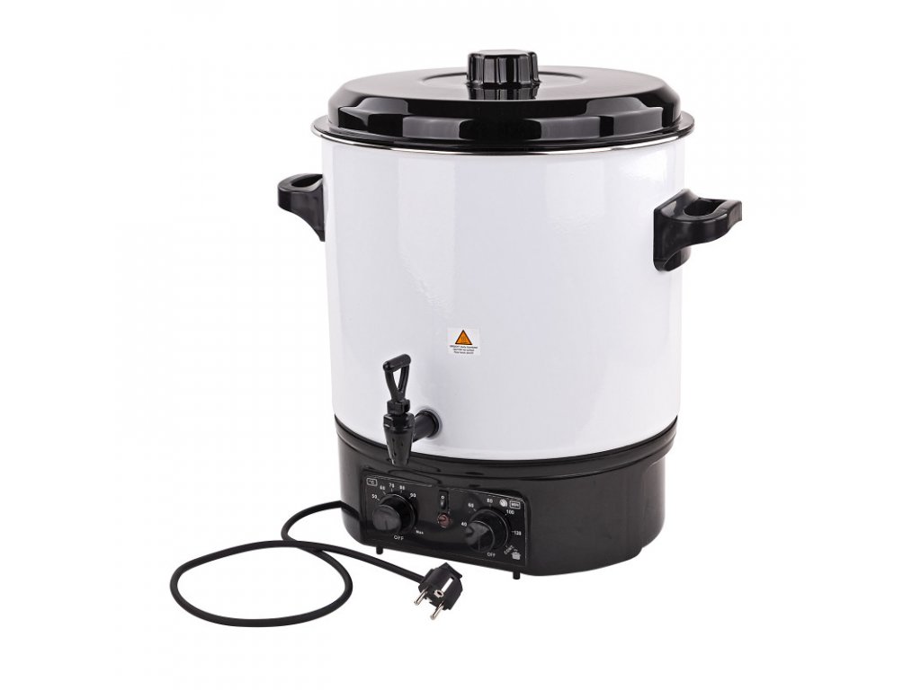 Elektrický hrniec s časovačom a alarmom. Pripravte si lahodný punč, varené víno alebo kávu ako na trhoch, oslavách a iných podujatiach. Uvarte si chutný guláš, chrumkavú klobásu alebo zdravú zeleninu. Elektrický hrniec s časovačom a alarmom. Pripravte si lahodný punč, varené víno alebo kávu ako na trhoch, oslavách a iných podujatiach. Uvarte si chutný guláš, chrumkavú klobásu alebo zdravú zeleninu. Výkonná elektrická vykurovacia špirála, veľká nádoba, zabudovaný časovač, alarm, ktorý je možné zapnúť a vypnúť pri dosiahnutí prednastavenej teploty, nepretržitá prevádzka pomocou termostatu, plynulé nastavenie teploty s poistkou proti prehriatiu, jednoduché čistenie vďaka smaltovanému povrchu a skrytému vykurovaciemu telesu, vypúšťací kohútik, tepelne izolované rukoväte, kontrolka, PVC veko s tepelne izolovanou rukoväťou, vkladací plastový rošt na odkladanie zaváracích pohárov, pogumované nožičky. Prípojka: 230 V / 50 Hz Výkon špirály: 1800 W Trieda ochrany: 1 Druh ochrany: IPX1 Tepelný rozsah: 30 - 100 °C Objem: 27 l Časovač: 0 - 120 min. Využiteľné rozmery nádoby (ØxV): 350 x 285 mm Prípojný kábel: 900 mm Celkové rozmery (ŠxHxV): 460 x 420 x 490 mm Hmotnosť: 6 kg Dodatok k návodu na obsluhu: Funkcia ľavého otočného gombíka: funkcia termostatu od 0 - 100 °C Funkcia pravého otočného gombíka: funkcia časovača pri otáčaní v smere hodinových ručičiek trvalá funkcia pri otáčaní proti smeru hodinových ručičiek (funkcia blokovania) Červené kontrolné svetlo: rozsvieti sa, keď je vyhrievanie v prevádzke Kolískový spínač pomocou kontrolky: prepínateľný zvukový alarm, keď sa dosiahne nastavená teplotaDodatočné parametre