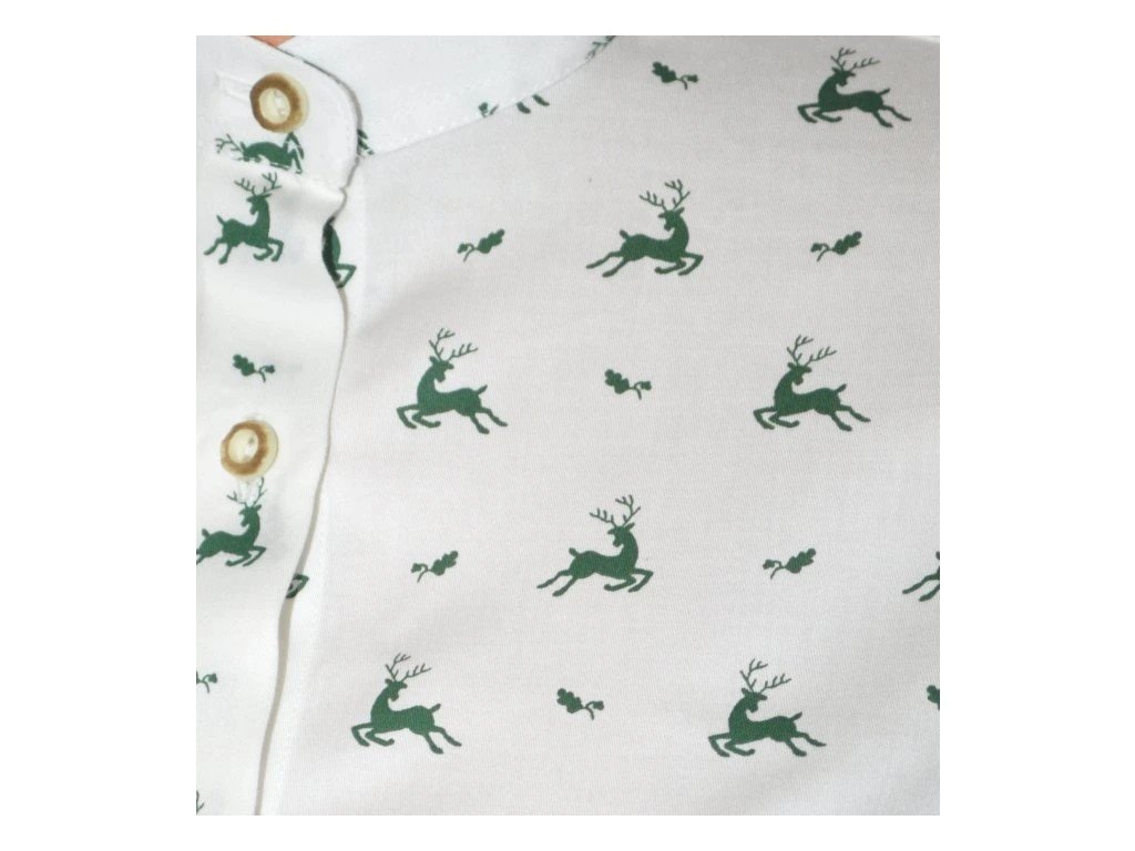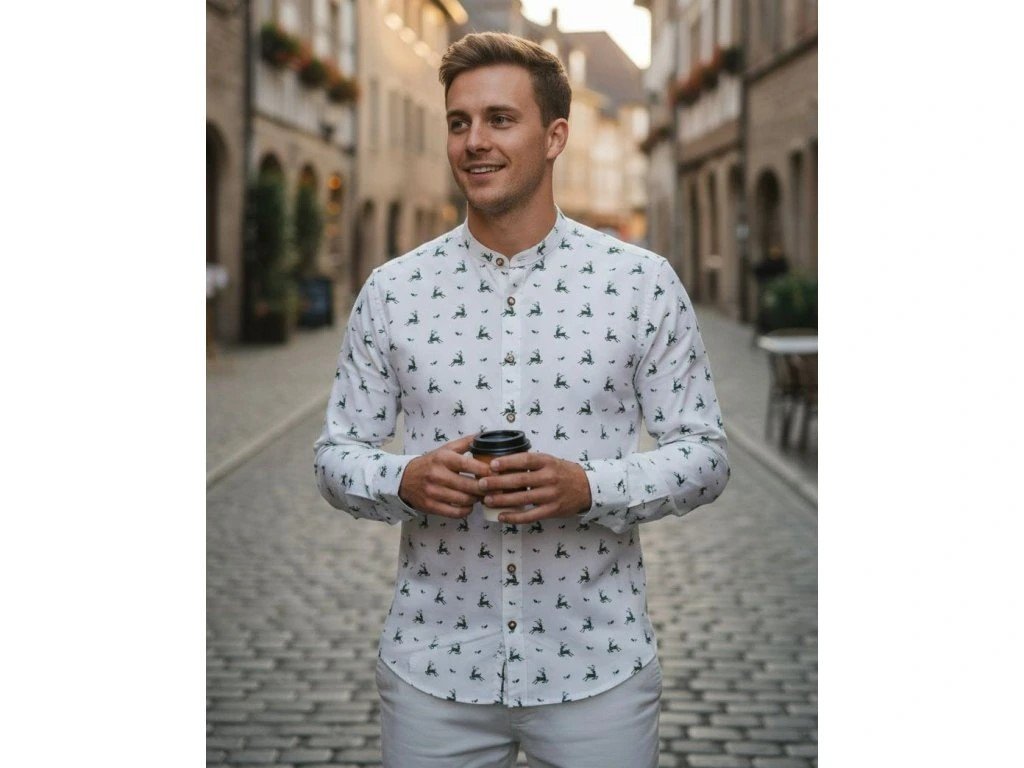 Pánska košeľa s dlhým rukávom zo 100% bavlny v saténovom prevedení, má strih SLIM FIT. Biele farby so vzormi zelených jelínkov.