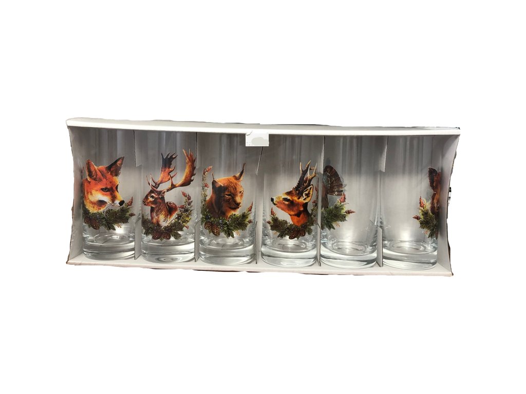 3dl poháre zo skla s poľovnícky motív dekor hlavy zvierat.Súprava 6 ks pohárov na ktorých je poľovnícky motív hlavy zvierat.Praktický darček pre mužov aj poľovníkov.Na pohároch je sada motívov zvieraťa od jeleňa po diviaka. Tieto poľovnícke poháre sú určené na džús alebo vodu do každej chaty, chalupy, či poľovníckej izby.