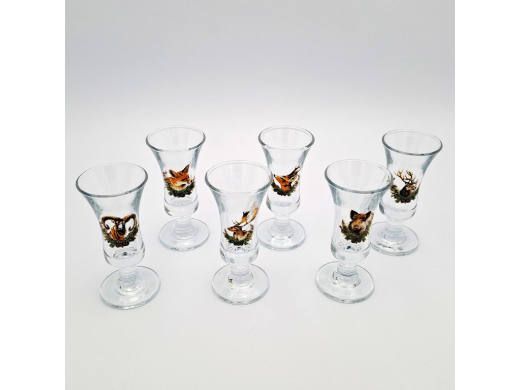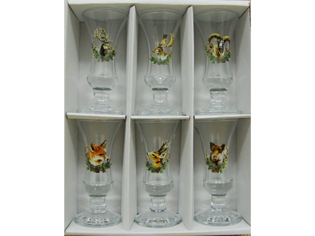 50 ml poháre zo skla s poľovníckym motívom hlavy zvierat. Sada 6 ks "Jäger" pohárikov s poľovníckym motívom.Typ a tvar pohárika je vhodný pre ľudí, ktorí uprednostňujú kvalitný alkohol a chcú si vychutnať vôňu i chuť.Veľmi obľúbené ako darček nielen pre pre poľovníka ale i milovníka prírody.Objem 50ml.