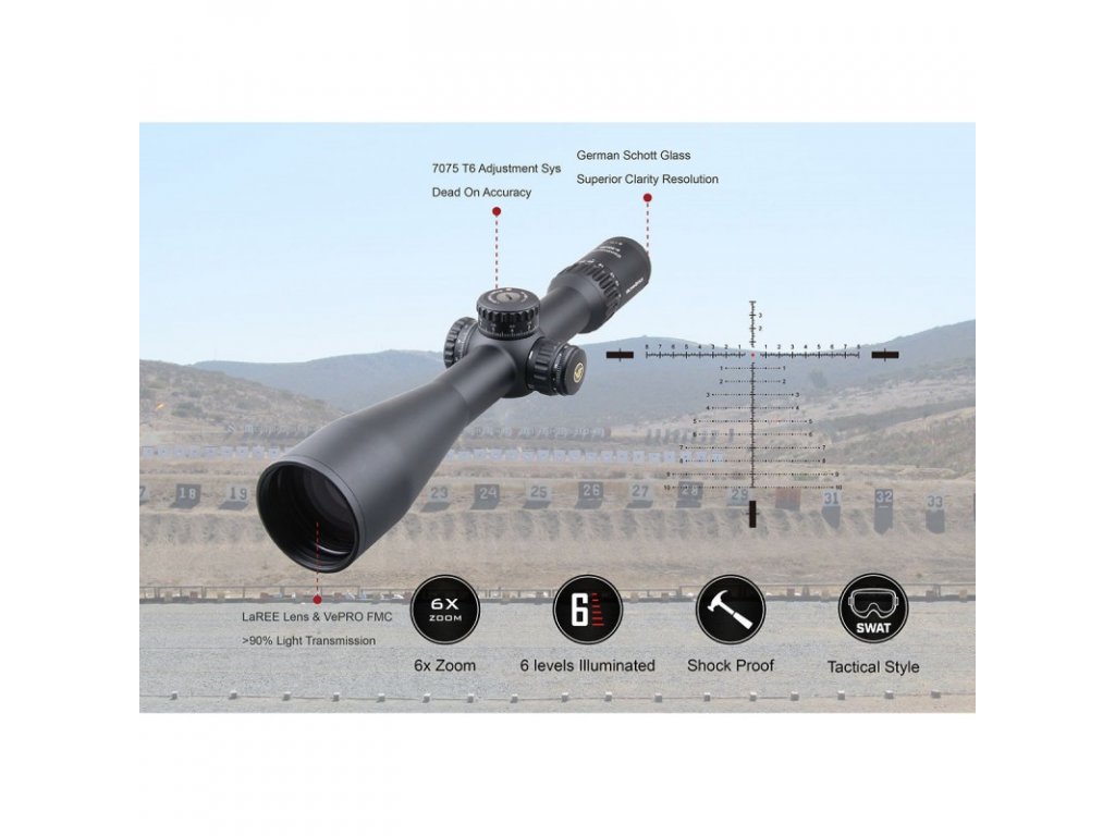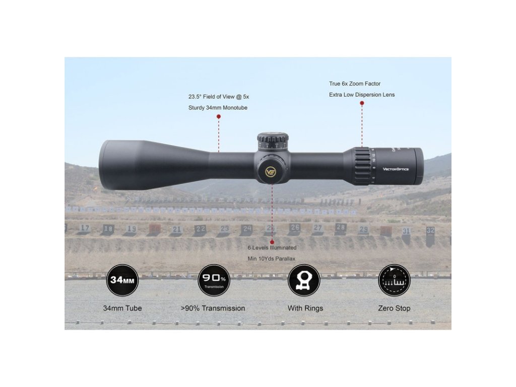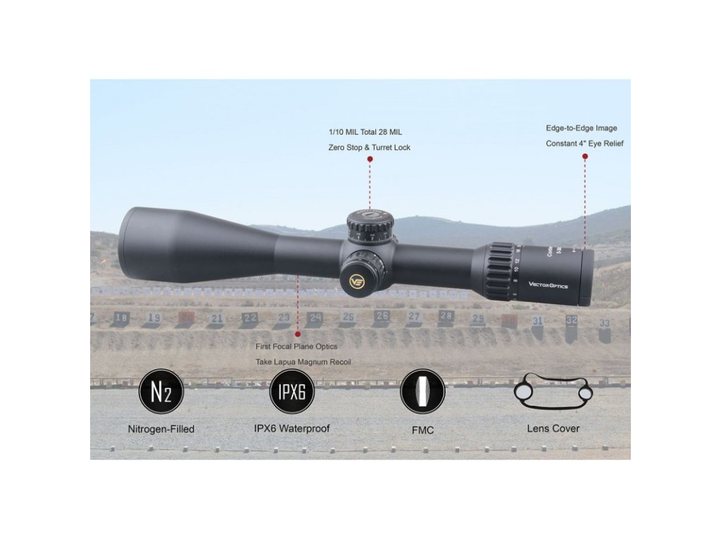 Puškohľad Vector Optics Continental s krížom v prvej ohniskovej rovine (FFP) a priblížením 5-30x56 spadá do najvyššej rady optických zariadení spoločnosti, ktorá môže konkurovať puškohľadom svetovo známych značiek vďaka nemeckému optickému systému s krištáľovo čistým obrazom. Ten je tvorený za pomoci skiel Schott ED HD, pričom šošovky LeREE a VePRO FMC dosahujú priepustnosť svetla viac ako 90%, čo je ideálne pri použití za úsvitu a súmraku. Jednodielny vysokokvalitný hliníkový tubus s priemerom 34mm je zárukou vysokej odolnosti a životnosti, čo garantuje doživotná záruka výrobcu. Puškohľad je navyše plnený dusíkom, takže sa pri zmene klimatických podmienok nezahmlieva. Stupeň ochrany proti vode IPX6. Vleptaný taktický kríž VCT-34FFP s osvetlením stredového bodu v konfigurácií MIL je ovládaný vežičkami s uzamykateľným systémom doplnený o možnosť nulovania, čo umužňuje presné a jednoduché nastavenie v počte 100 klikov na jednú celu otáčku vo výškovom rozsahu 26MIL. Nastaviteľná paralaxa poskytuje vynikajúce zaostrenie obrazu od 10m až do nekonečna, takže streľba na dlhé vzdialenosti nebude problematická, čím sa stáva vhodným kandidátom ako pre poľovníkov, tak aj pre športových strelcov.