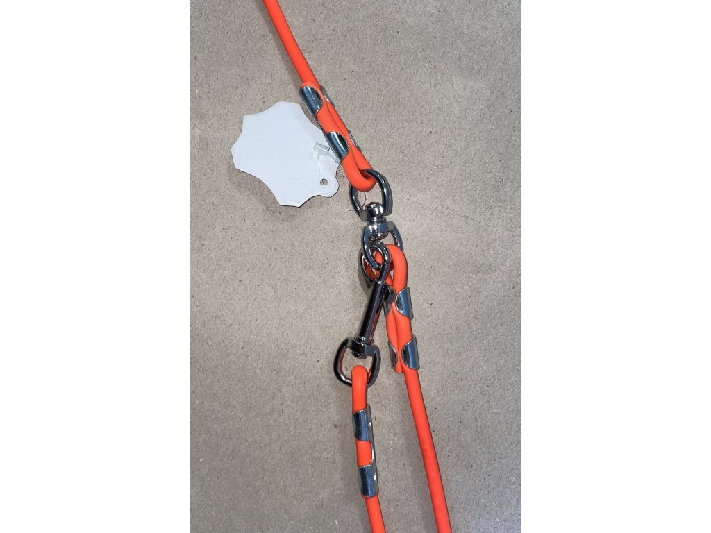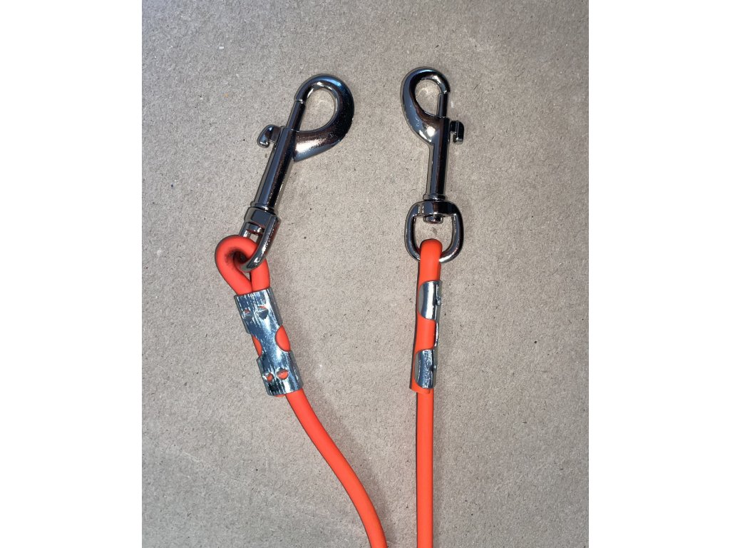 Vypúštacie vodítko pre 2 psov orange je jedinečný a innovatívny produkt, ktorí sa vyznačuje extrémne odolnou povrchovou úpravou. Je vyrobené z PVC materiálu, ktorý je odolný voči ťahaniu a odoláva poveternostným vplyvom. Vodítko je vyrobené z extrémne odolného a viditeľného materiálu, je ukončené s nerezovou vypúšťacou karabínou. Materiál hladko kĺže po zemi, nezamotáva sa a pritom je príjemný a nekĺzavý v ruke. Je veľmi odolný, nenasiakavý, nepohlcujúci pachy a umývateľný.