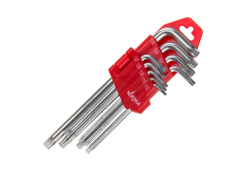 Kľúče s Torx hlavou z pozinkovanej chróm - vanádiovej ocele, dlhé prevedenie umožňuje lepšiu manipuláciu a vyšší krútiaci moment aj u menej prístupných spojov. Sadu tvoria najčastejšie používané veľkosti. Praktický držiak s označením veľkostí. Kľúče s Torx hlavou z pozinkovanej chróm - vanádiovej ocele, dlhé prevedenie umožňuje lepšiu manipuláciu a vyšší krútiaci moment aj u menej prístupných spojov. Sadu tvoria najčastejšie používané veľkosti. Praktický držiak s označením veľkostí. Veľkosť x dĺžka: T10 x 85 / T15 x 88 / T20 x 95 / T25 x 103 / T27 x 110 / T30 x 117 / T40 x 127 / T45 x 145 / T50 x 165 mm Rozmery sady (DxŠxV): 165 x 65 x 25 mm Hmotnosť: 290 gDodatočné parametre