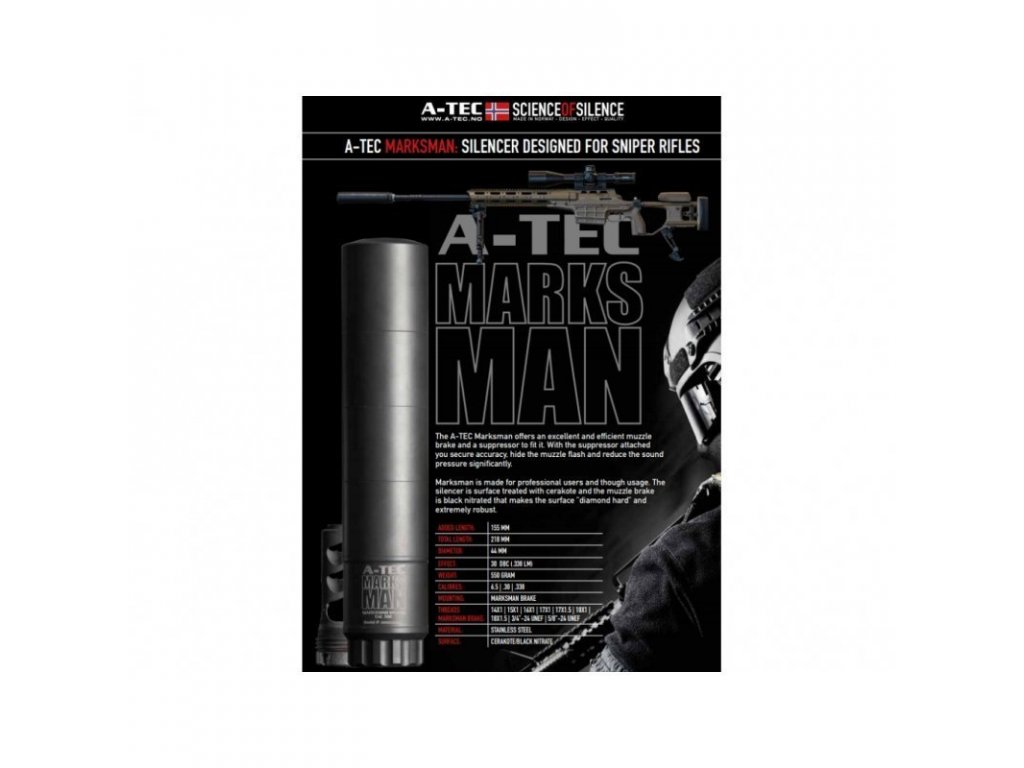 Tlmiče A-TEC Marksman sú aj oficiálnym modelom ponúkaným a používaným pre zbrane Accuracy International priamo na ich úsťové brzdy.