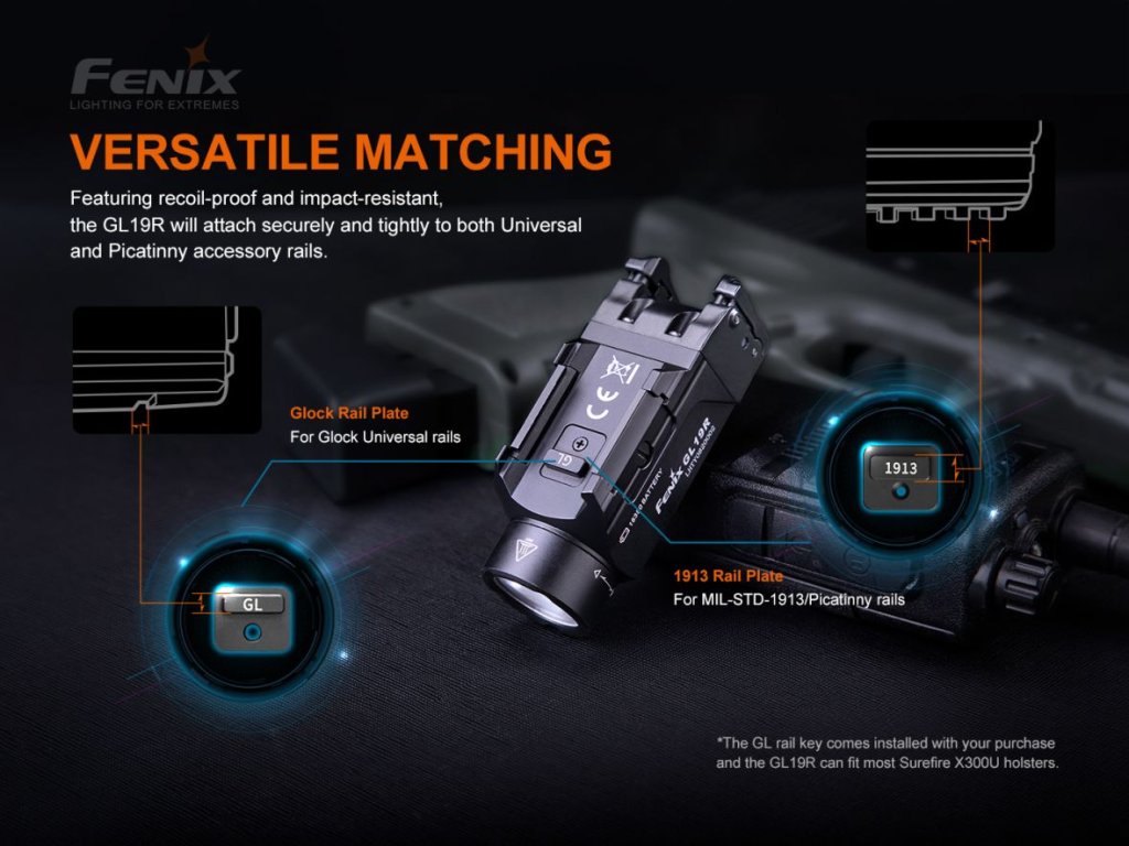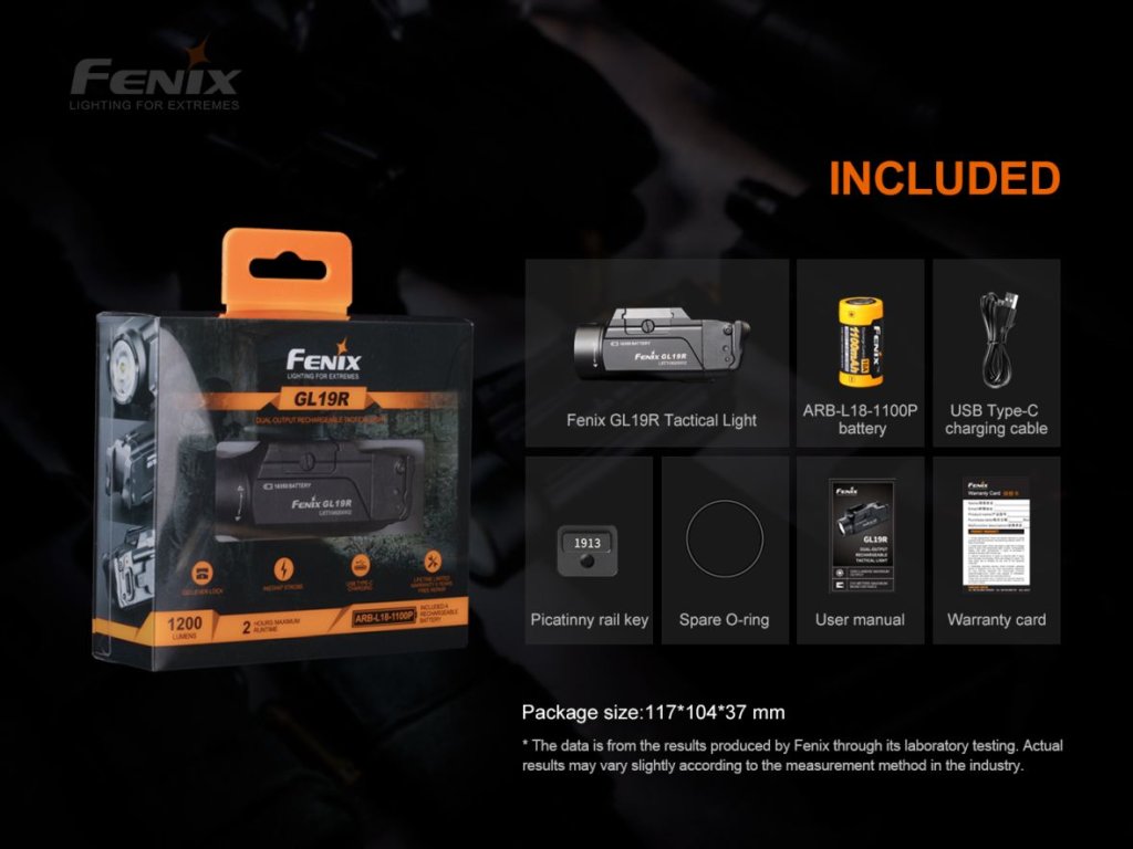 Nabíjateľné pištoľové LED svietidlo Fenix GL19R je skonštruované špeciálne pre použitie na krátkych zbraniach a v kombinácii s dialkovým spínačom AER-06S je možné ju použiť aj na zbrani dlhej vybavenej lištou štandardu Picatinny MIL-STD-1913. Ponúka špičkový výkon svetla 1200 ANSI lúmenov s dosvitom až 210 metrov. Svietidlo je napájané jedným Li-ion akumulátorom Fenix ARB-L18-1100P (veľkosť 18350), ktorý sa nabíja cez USB-C konektor priamo vo svietidle. Zjednodušené ovládanie svietidla je obojstranné (pre pravákov aj ľavákov). V prípade potreby je možné svietidlo prepnúť do nižšieho výkonu 350 lúmenov alebo ho možno okamžite prepnúť do stroboskopického blikania. Montáž na zbraňovú lištu je jednoduchá a nevyžaduje náradie - svietidlo sa nasunie na zbraňovú lištu a zaistí páčkou. Je možné ho pripevniť na zbraňové lišty štandardu Picatinny MIL-STD-1913 a GLOCK (nemusí pasovať na zbrane z kategórie slimline, napr. model Glock 30). Svietidlo je vhodné pre profesionálov, športových a hobby strelcov aj airsoft.